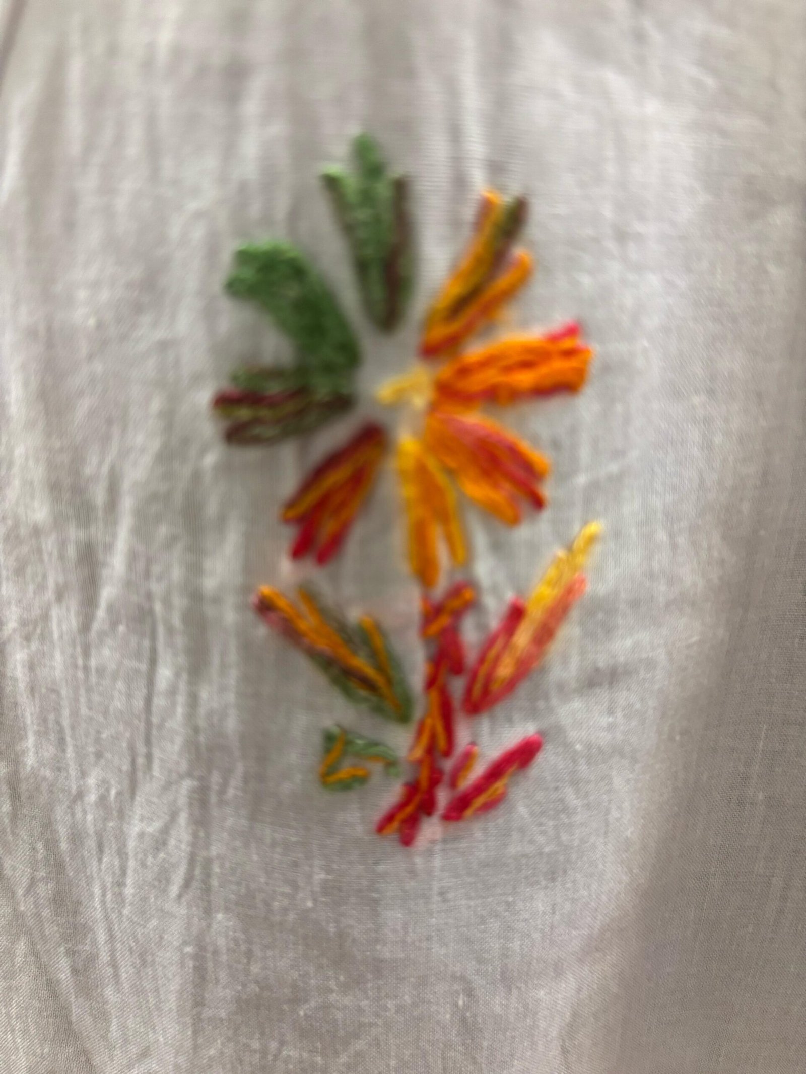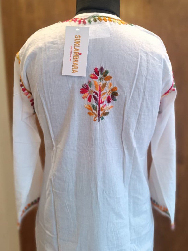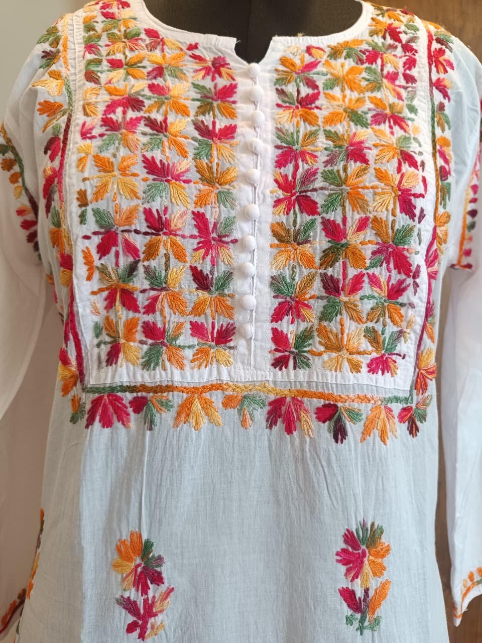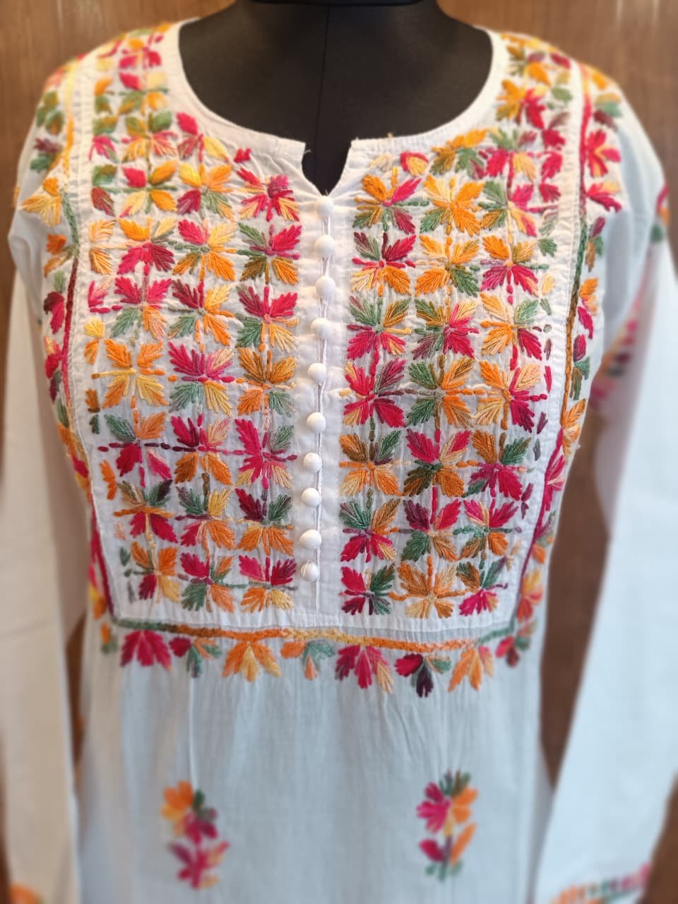Indulge in the exquisite allure of this Handmade Lucknowi Chikankari Kurta, delicately crafted to perfection. Made from soft, breathable off-white cotton, this traditional masterpiece seamlessly blends timeless style with modern appeal. The highlight is its intricate multicoloured embroidery, adding a splash of vibrant charm to this neutral base.