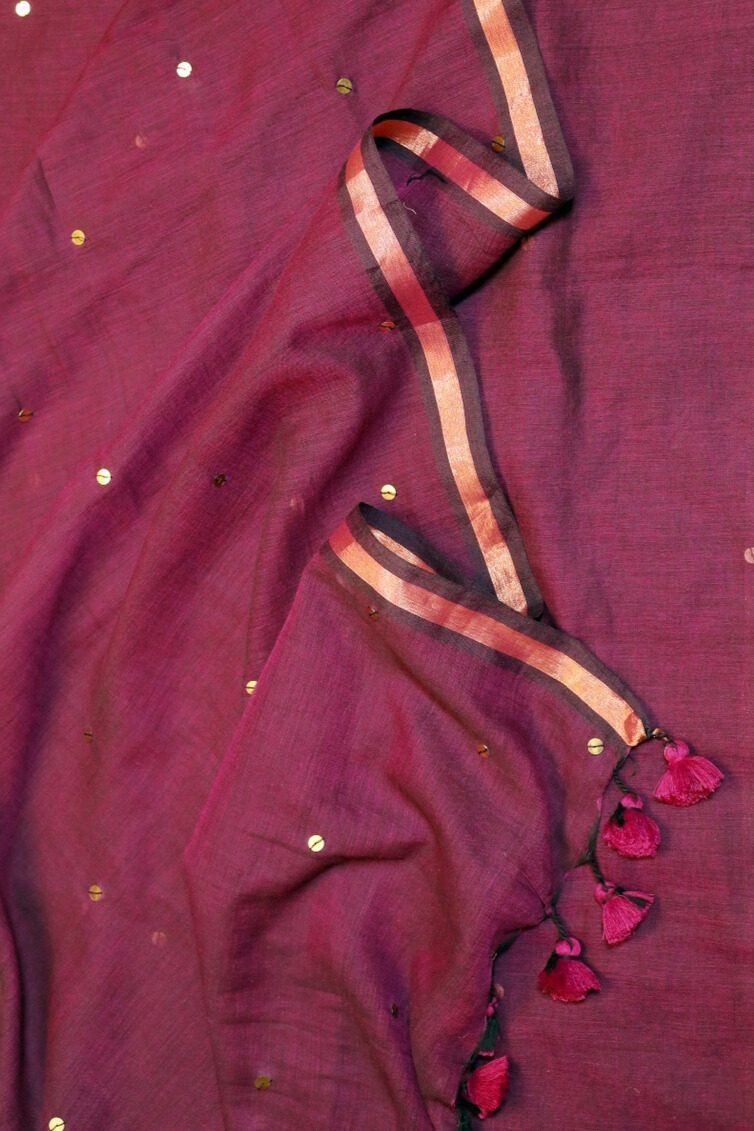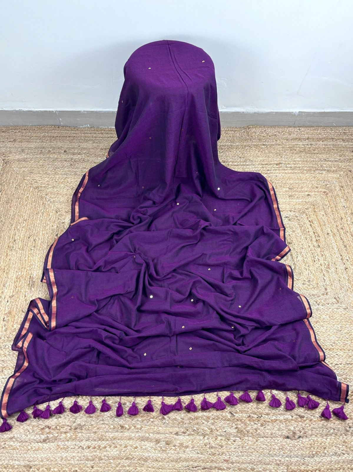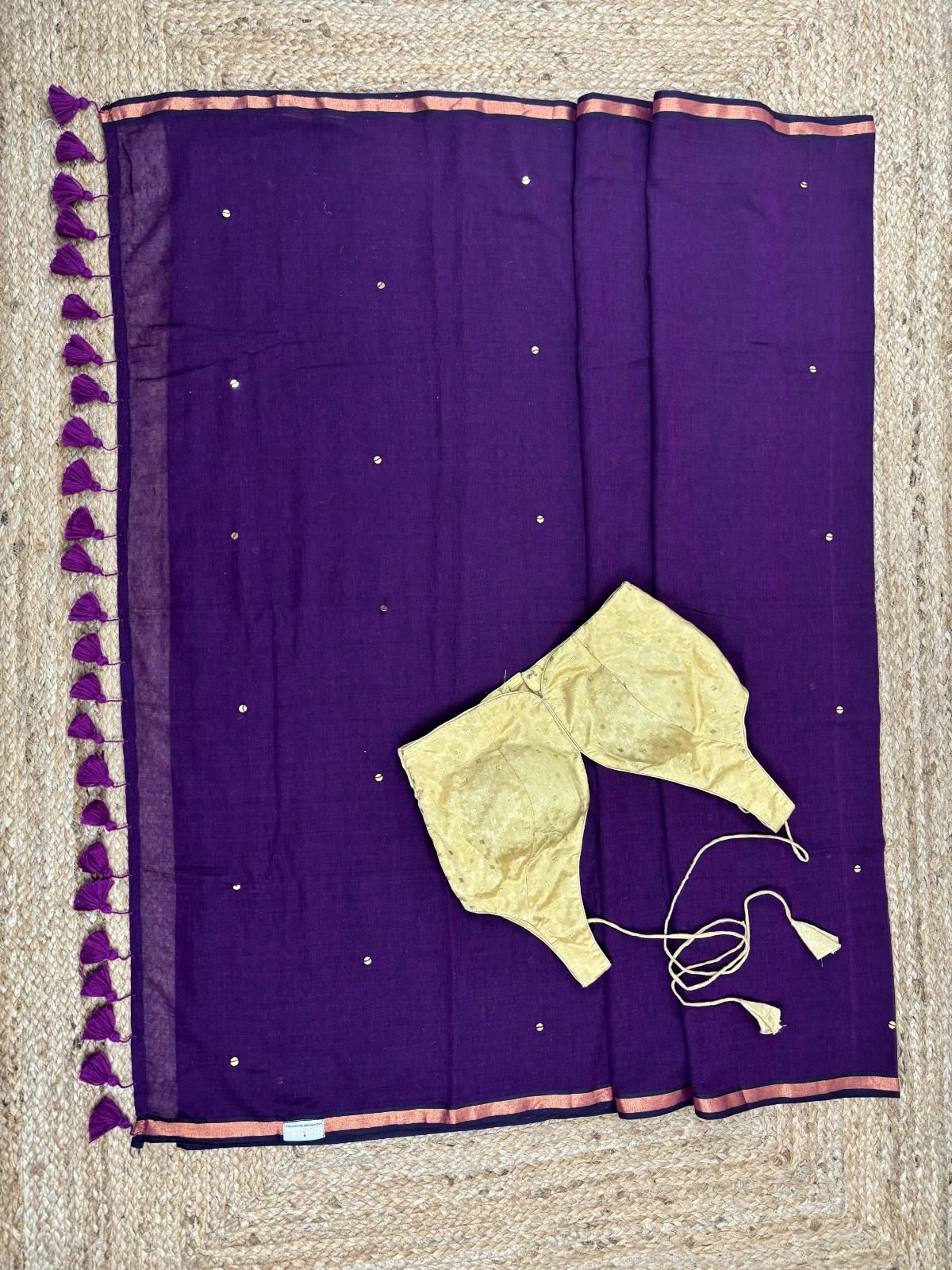 A stunning blend of tradition and elegance, this Purple Mul Cotton Saree with Golden Border & Coin Work is a timeless piece that radiates sophistication. Crafted from the softest mul cotton, it drapes gracefully, offering a feather-light feel and breathable comfort. The rich purple hue exudes regal charm, beautifully complemented by a shimmering golden border that adds a festive touch. Subtle golden coin embellishments are delicately scattered across the saree, enhancing its artisanal appeal. The pallu is finished with handmade purple tassels, adding a playful yet refined detail.