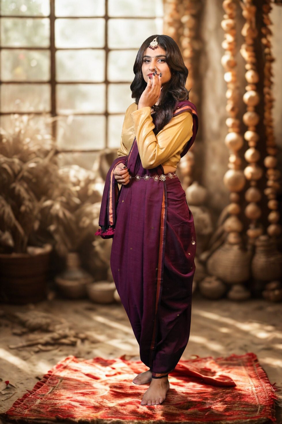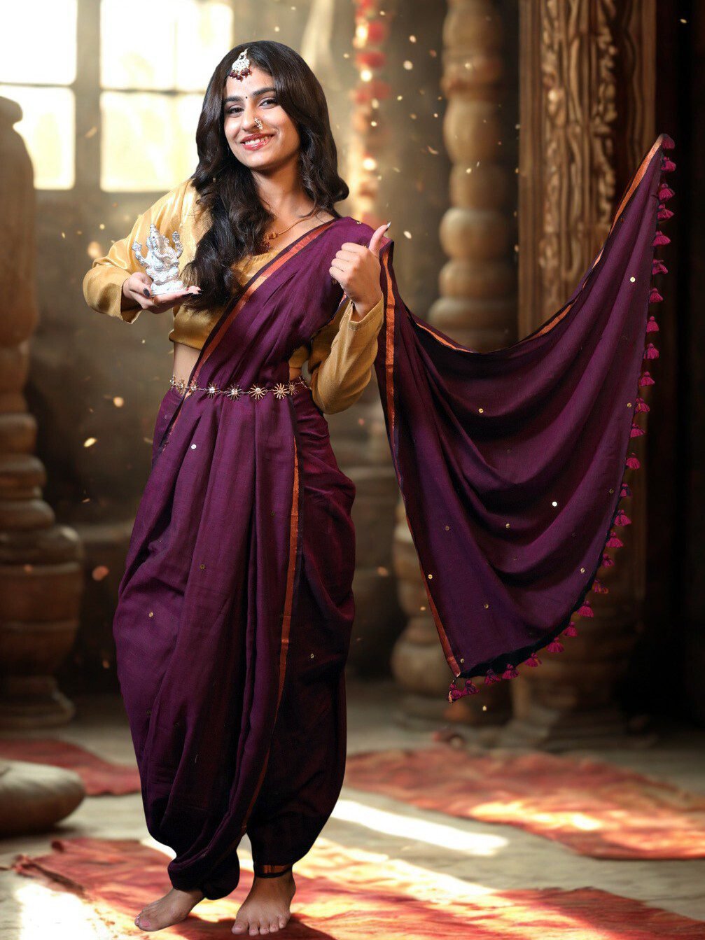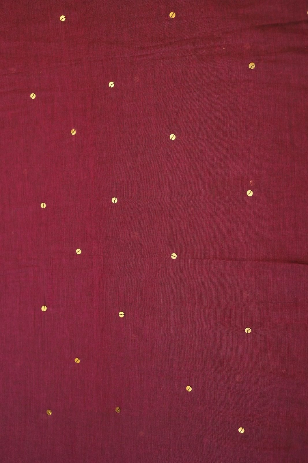 A stunning blend of tradition and elegance, this Purple Mul Cotton Saree with Golden Border & Coin Work is a timeless piece that radiates sophistication. Crafted from the softest mul cotton, it drapes gracefully, offering a feather-light feel and breathable comfort. The rich purple hue exudes regal charm, beautifully complemented by a shimmering golden border that adds a festive touch. Subtle golden coin embellishments are delicately scattered across the saree, enhancing its artisanal appeal. The pallu is finished with handmade purple tassels, adding a playful yet refined detail.