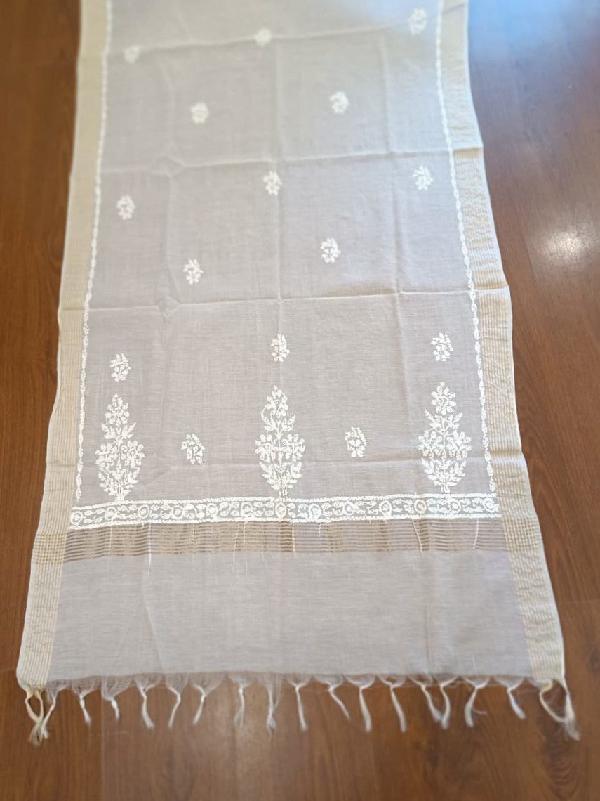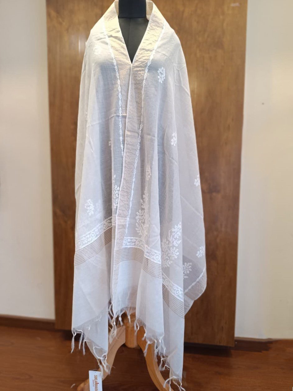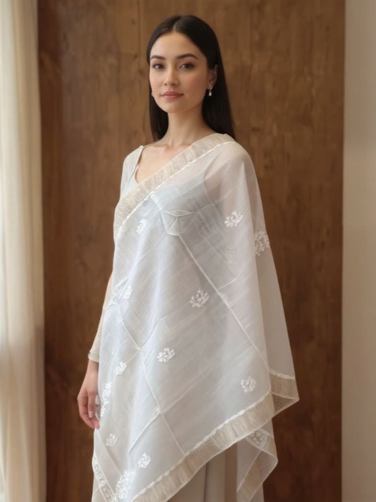 This handwoven white cotton dupatta is crafted with fine artistry and timeless grace. The lightweight fabric drapes effortlessly, offering both comfort and sophistication. Delicate floral motifs are intricately woven across the surface, adding a touch of understated charm. Finished with a subtle zari border, this dupatta beautifully complements both traditional and contemporary ensembles. A timeless addition to any wardrobe, this dupatta embodies the purity and craftsmanship of traditional Indian handloom artistry.