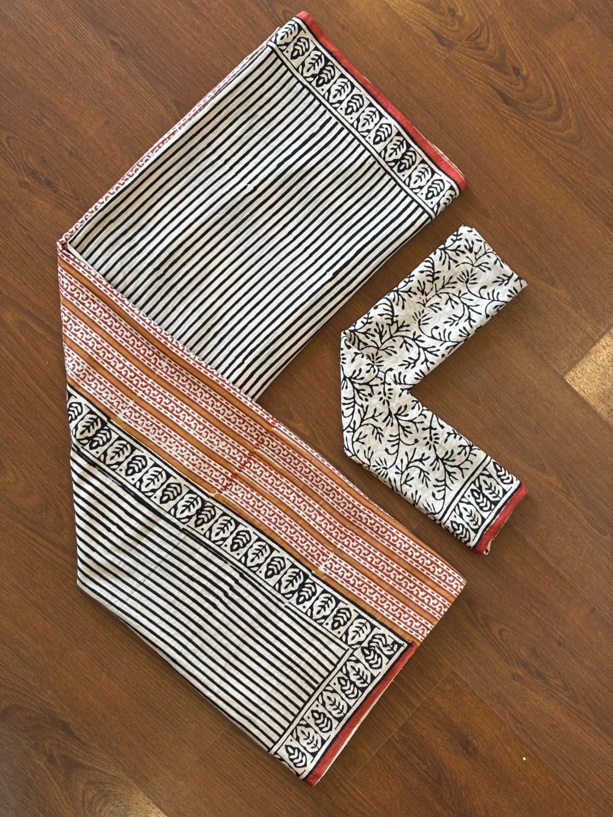 The saree features classic black and white stripes complemented by intricate Bagru motifs in earthy rust and black tones. The contrasting red border adds a refined touch, enhancing its traditional charm. Each motif is hand-printed using natural dyes, reflecting the authenticity and heritage of Bagru printing.