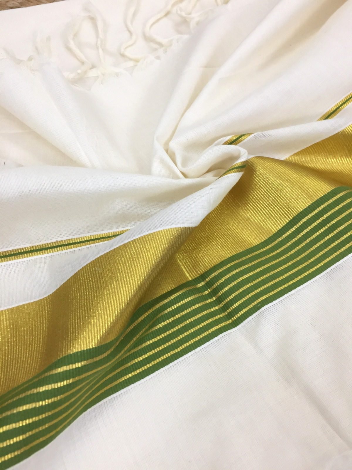 Off-White Kerala Cotton Kasavu Saree, beautifully accented with a festive golden zari and pea green border. Woven from pure Kerala cotton, this saree offers a soft, breathable texture and a graceful drape, making it perfect for traditional celebrations, temple visits, and festive occasions.