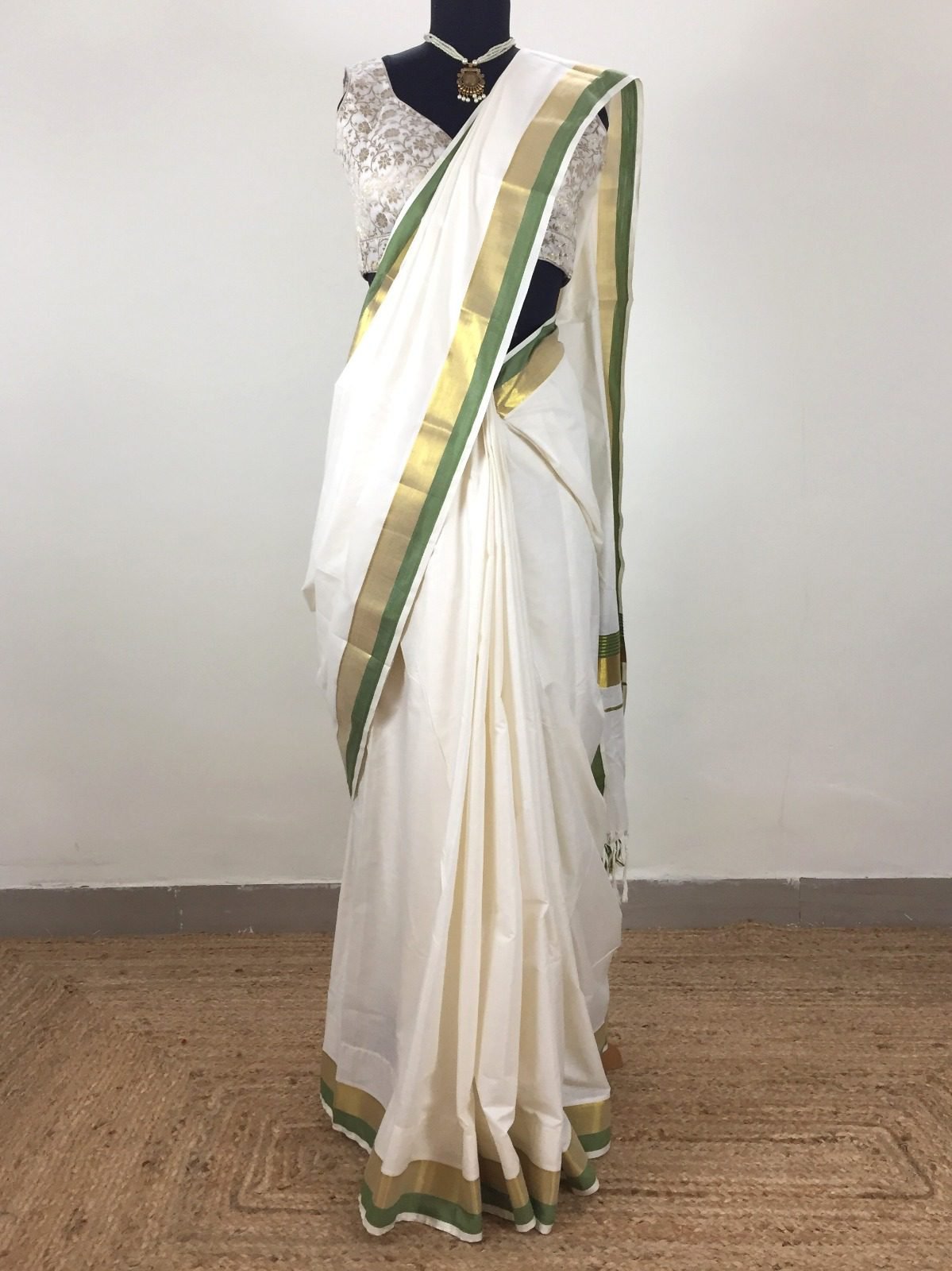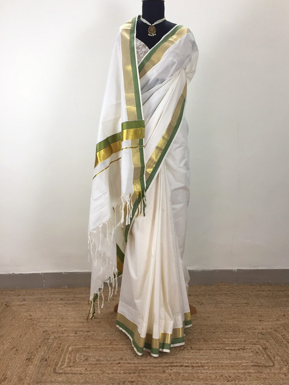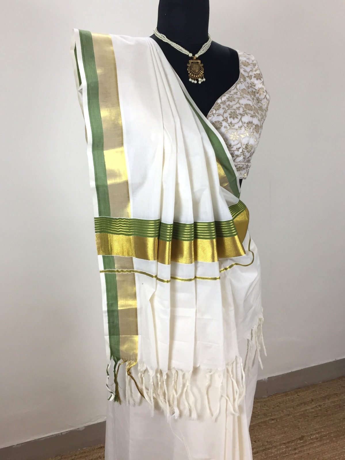 SAREEOff-White Kerala Cotton Kasavu Saree with Pea Green and Golden Zari Border & Blouse Piece