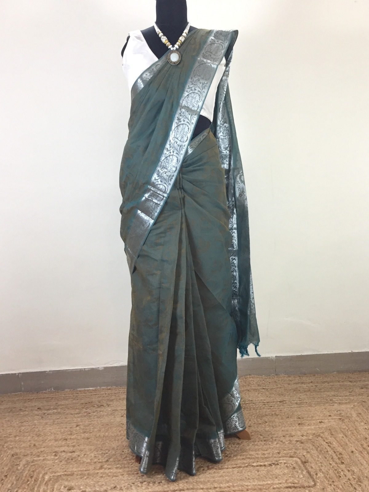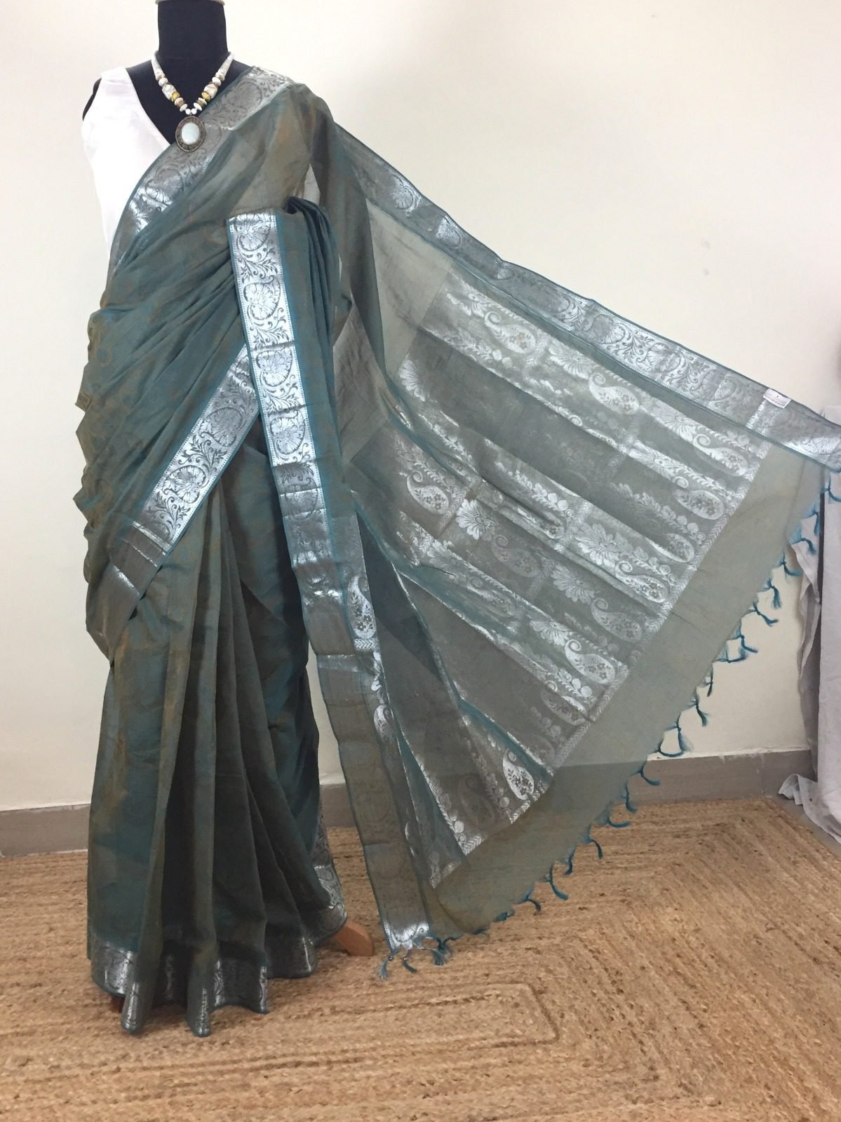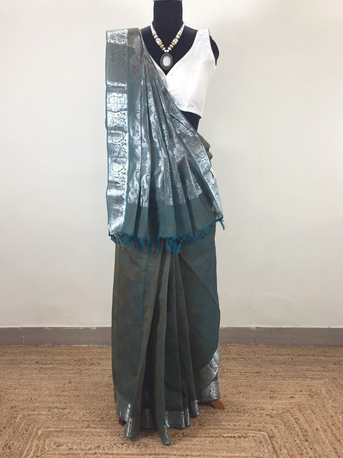 • Border & Pallu: Intricately woven silver zari floral patterns
