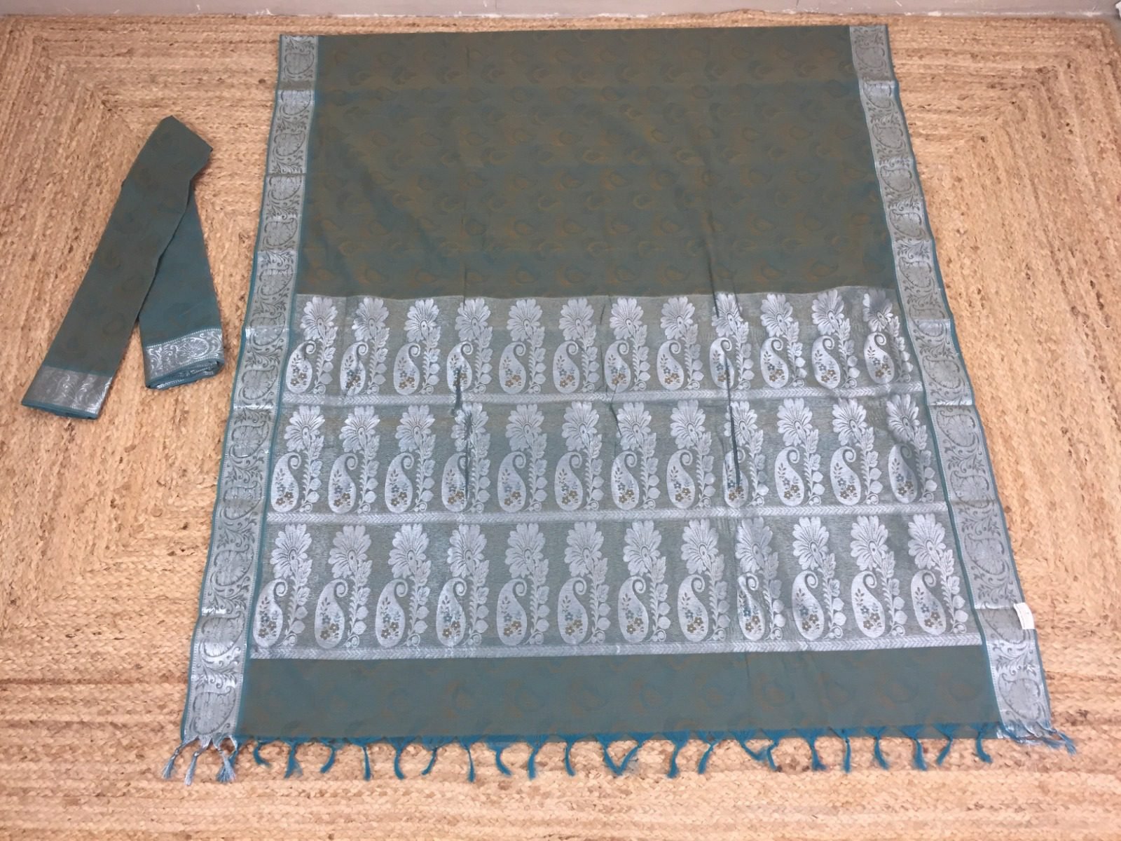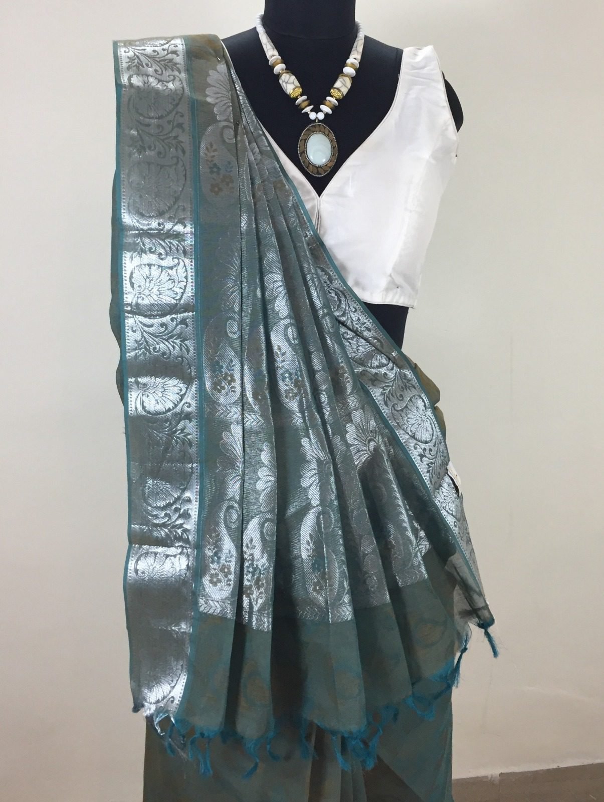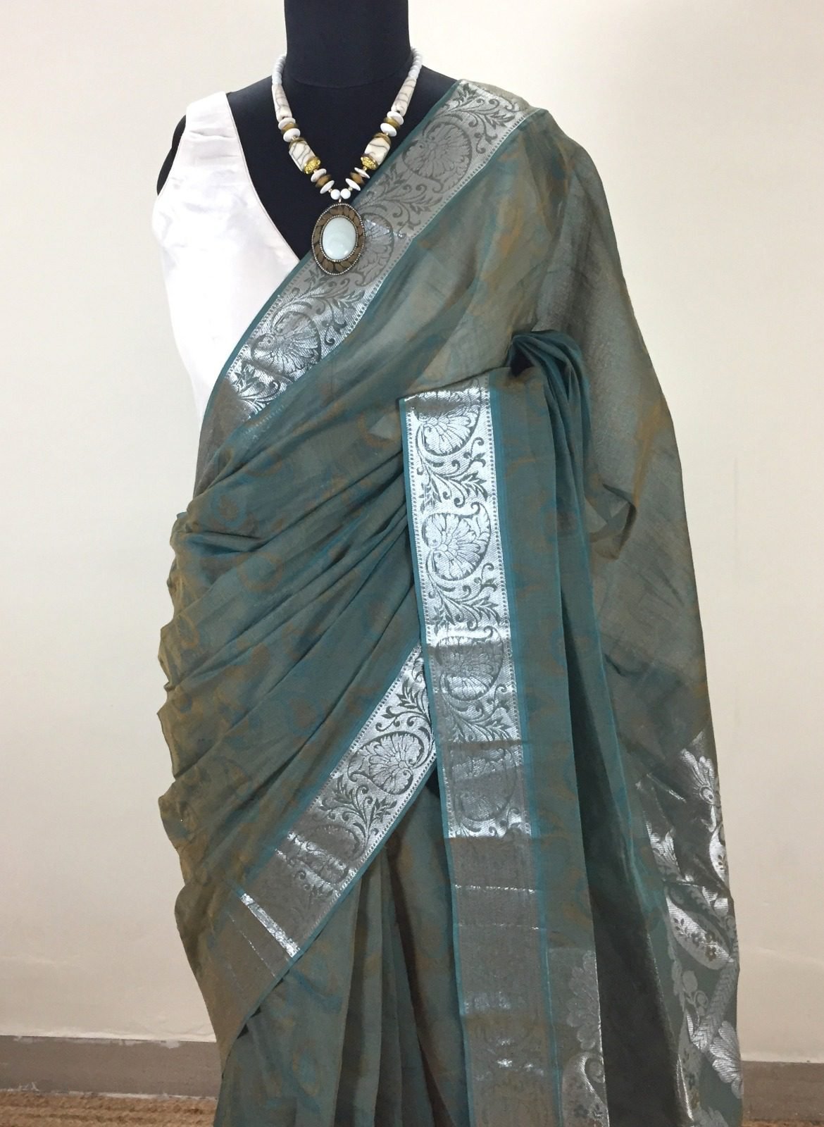 • Border & Pallu: Intricately woven silver zari floral patterns