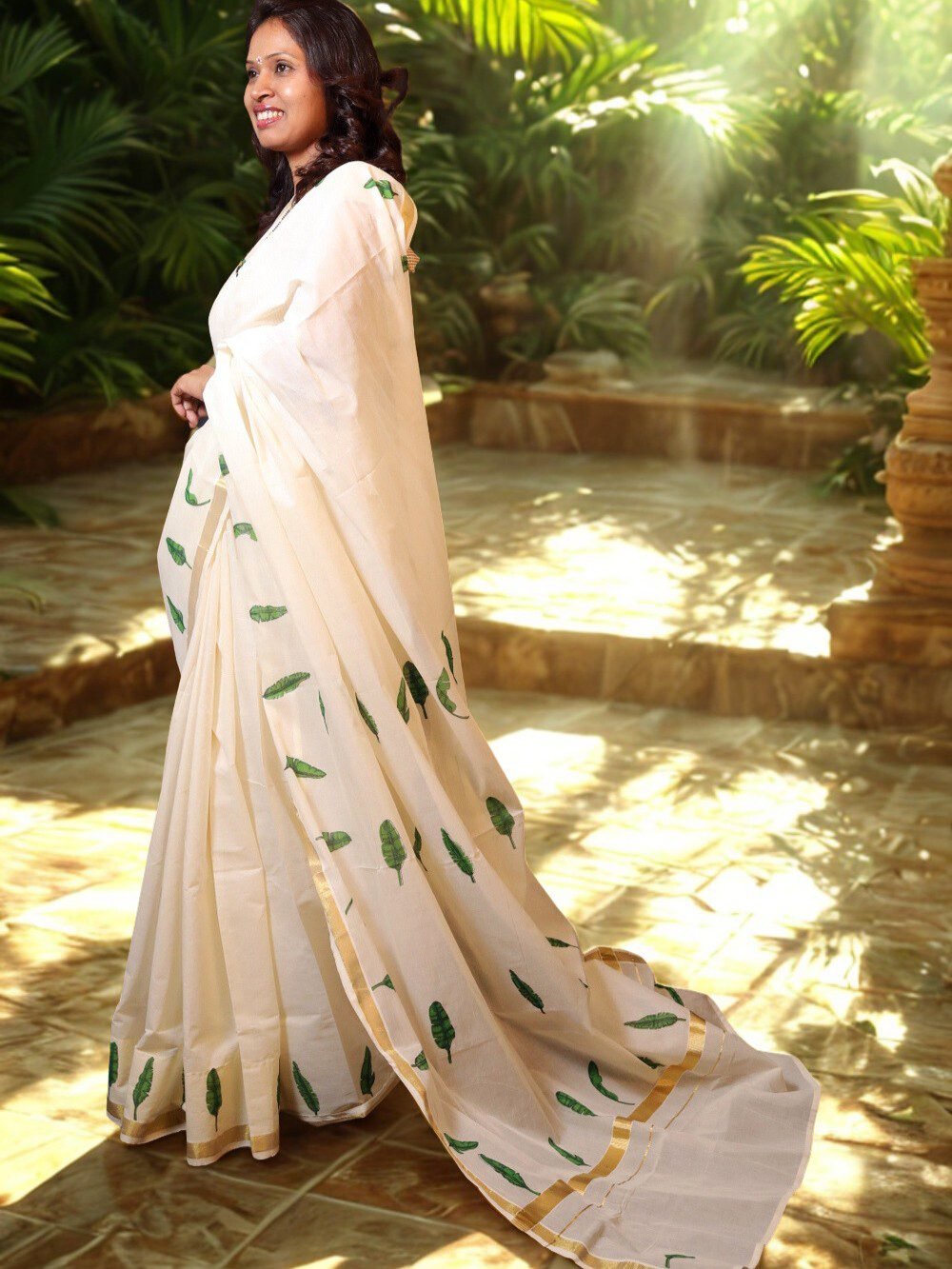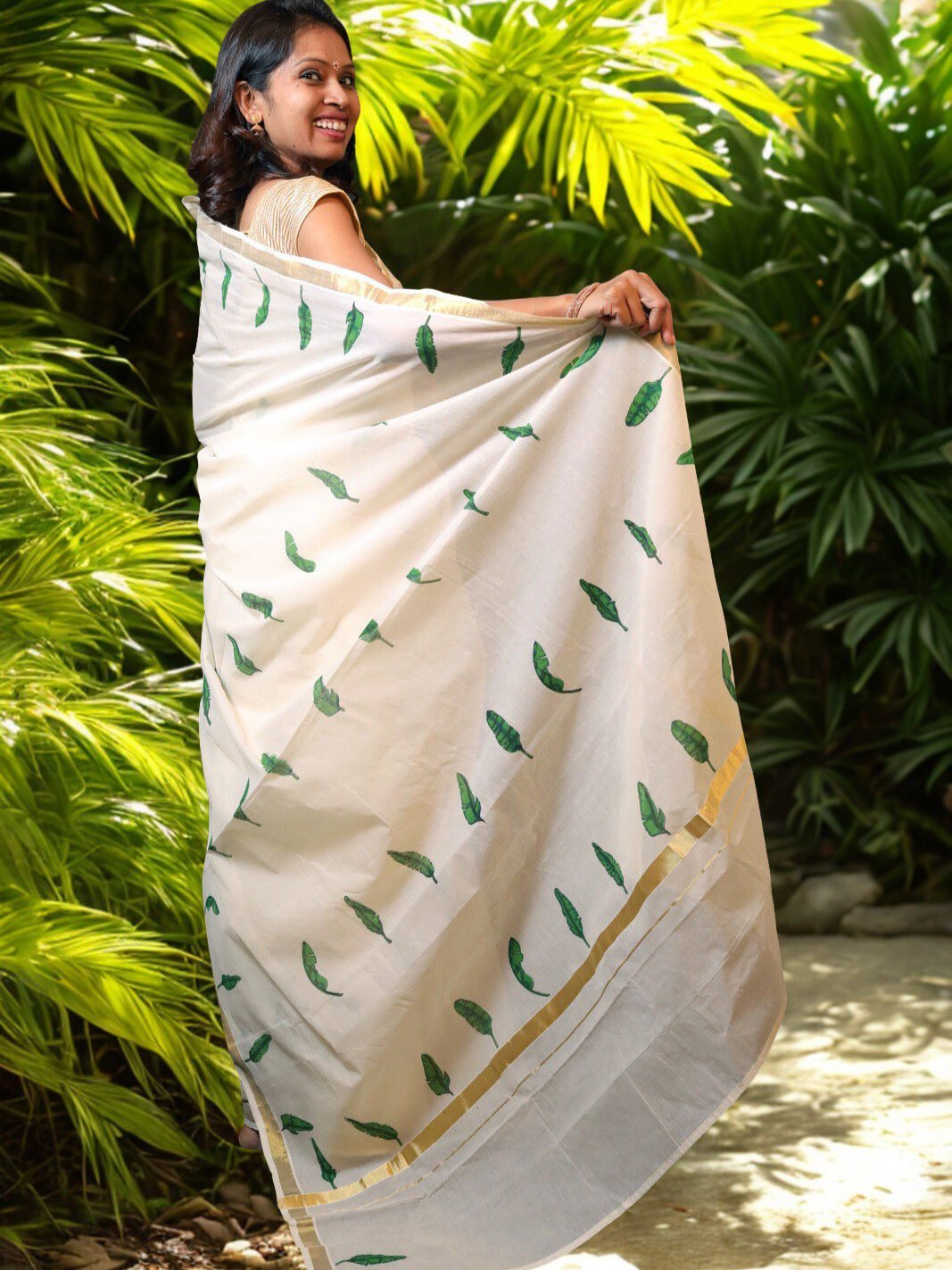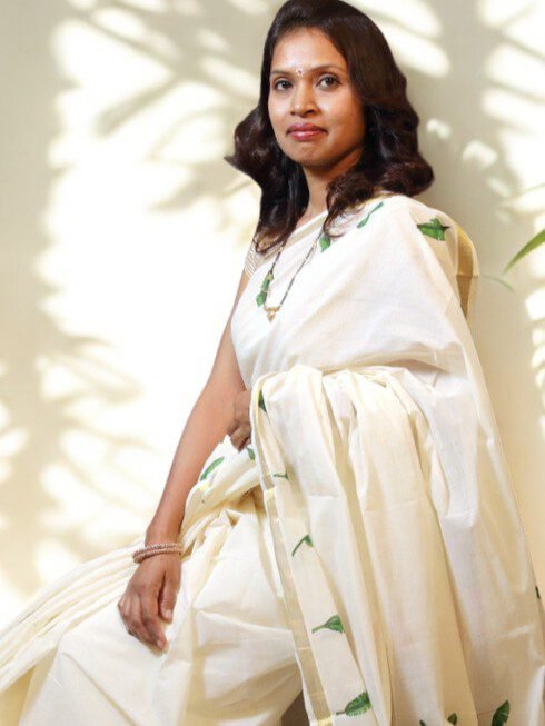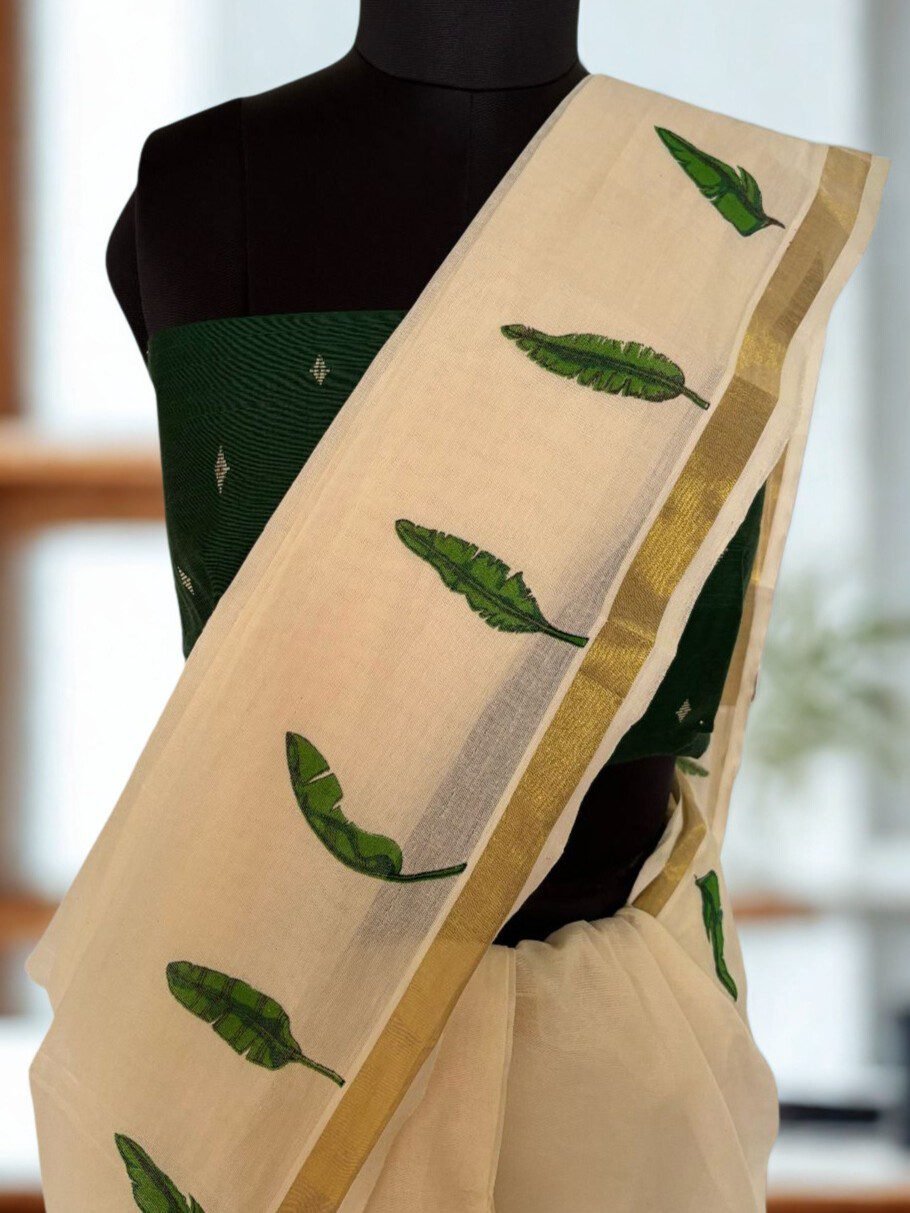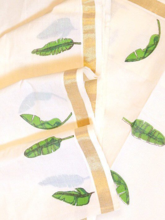 Cotton Kasavu Off White Handloom Designer Saree with Banana Leaf Motifs