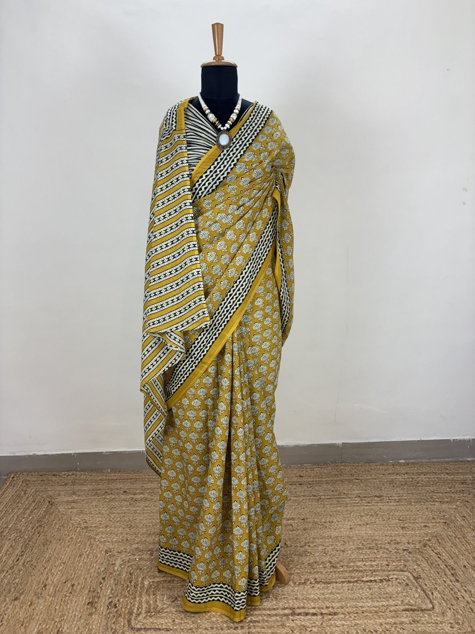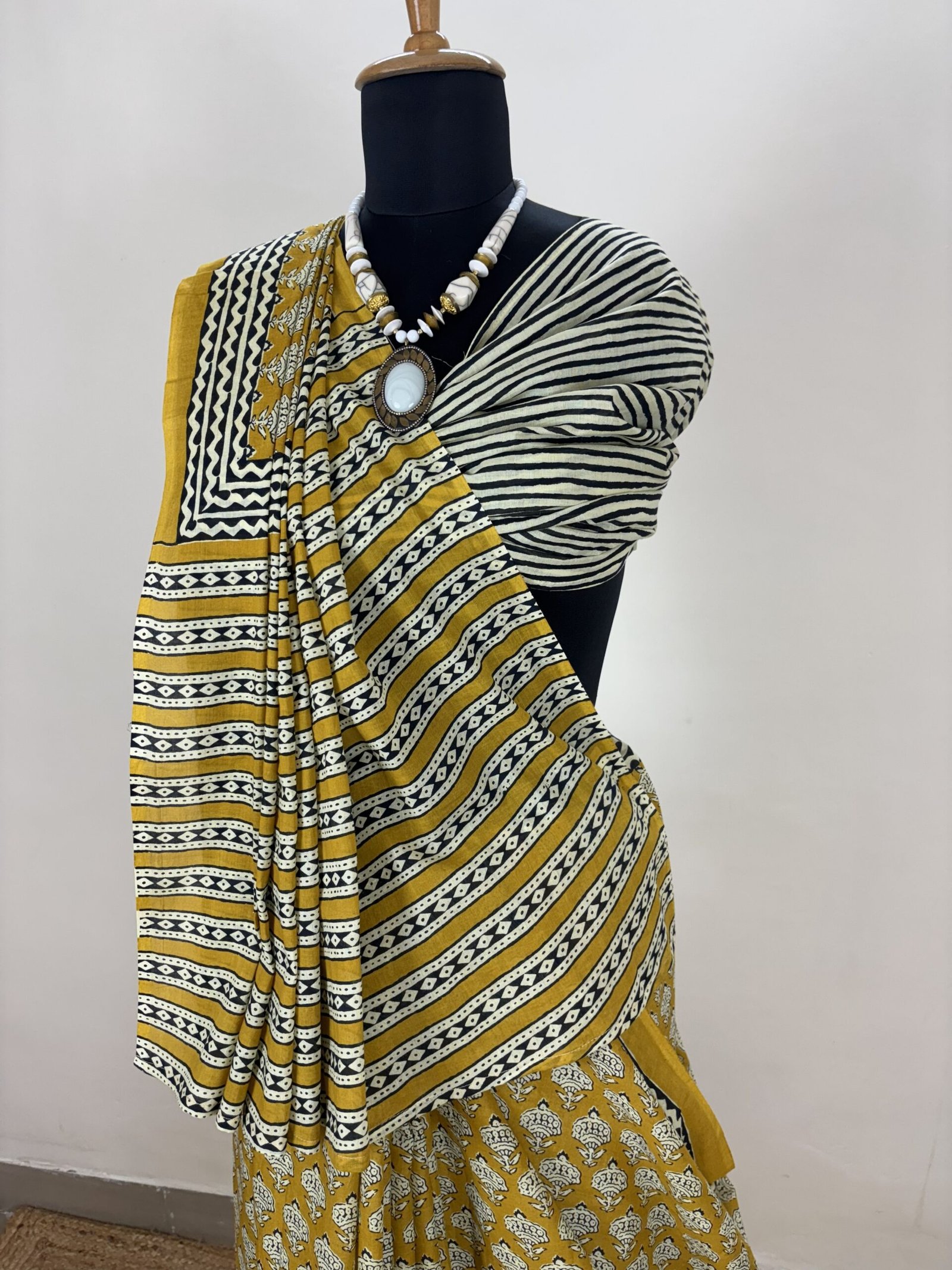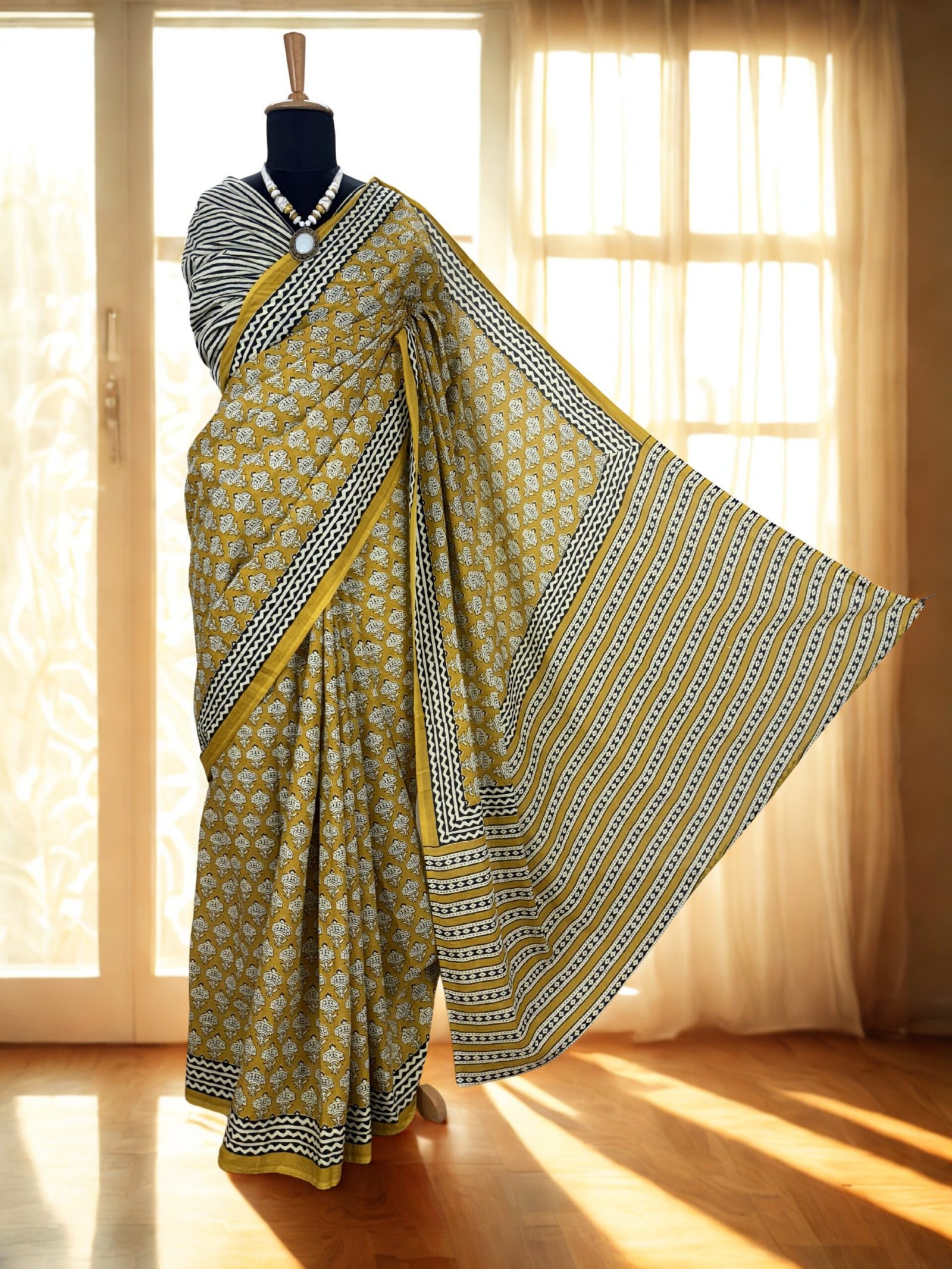 Made from soft, breathable cotton, this saree drapes gracefully and ensures all-day comfort—perfect for both casual gatherings and festive occasions. The harmonious blend of earthy mustard tones with monochrome accents adds a refined charm to any wardrobe.