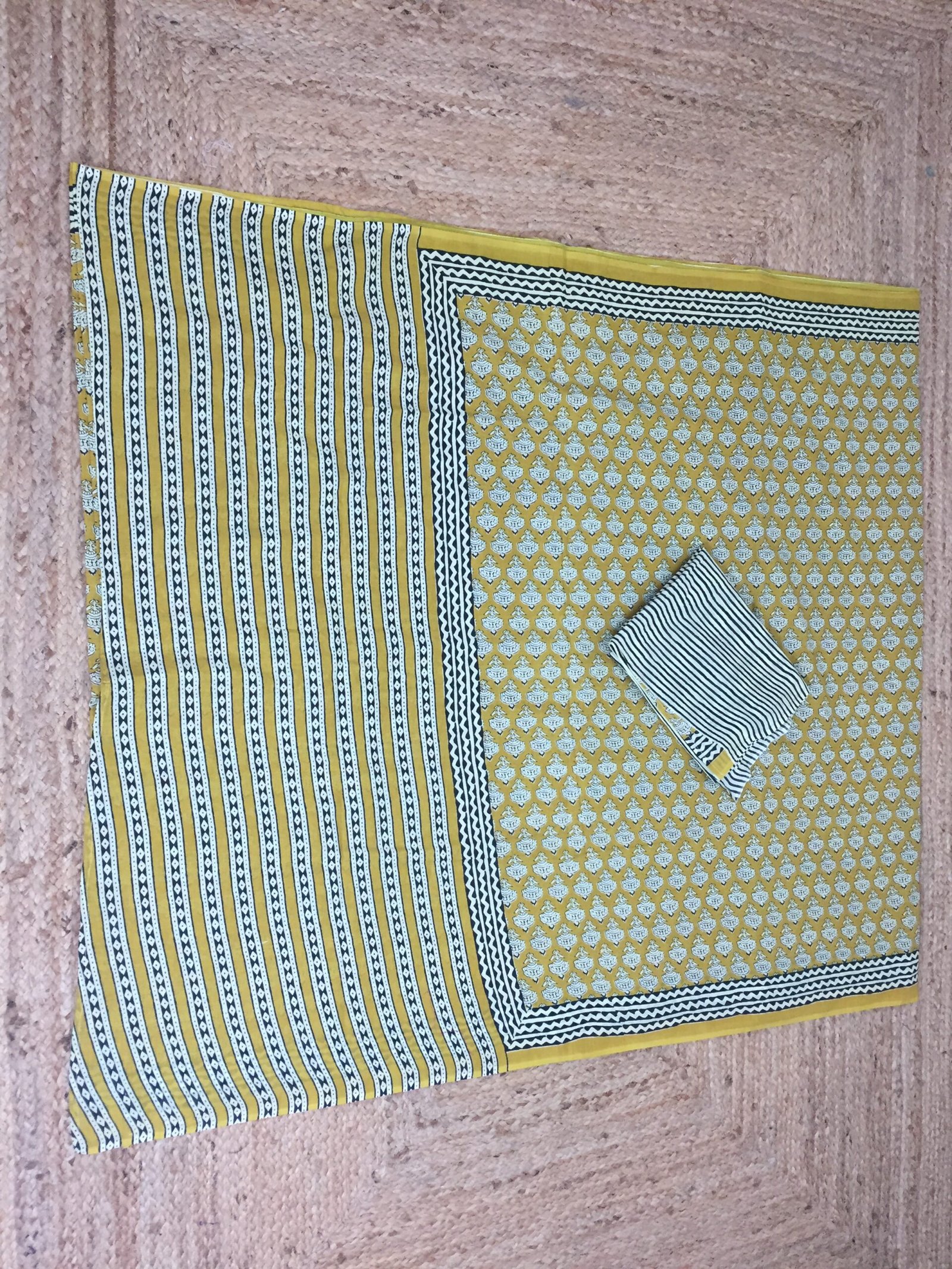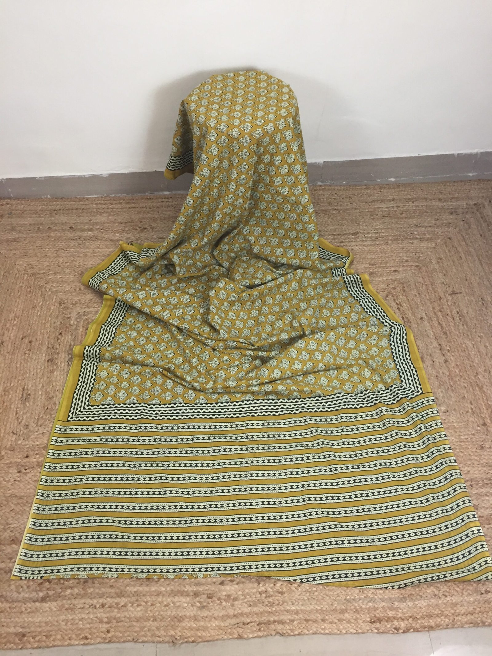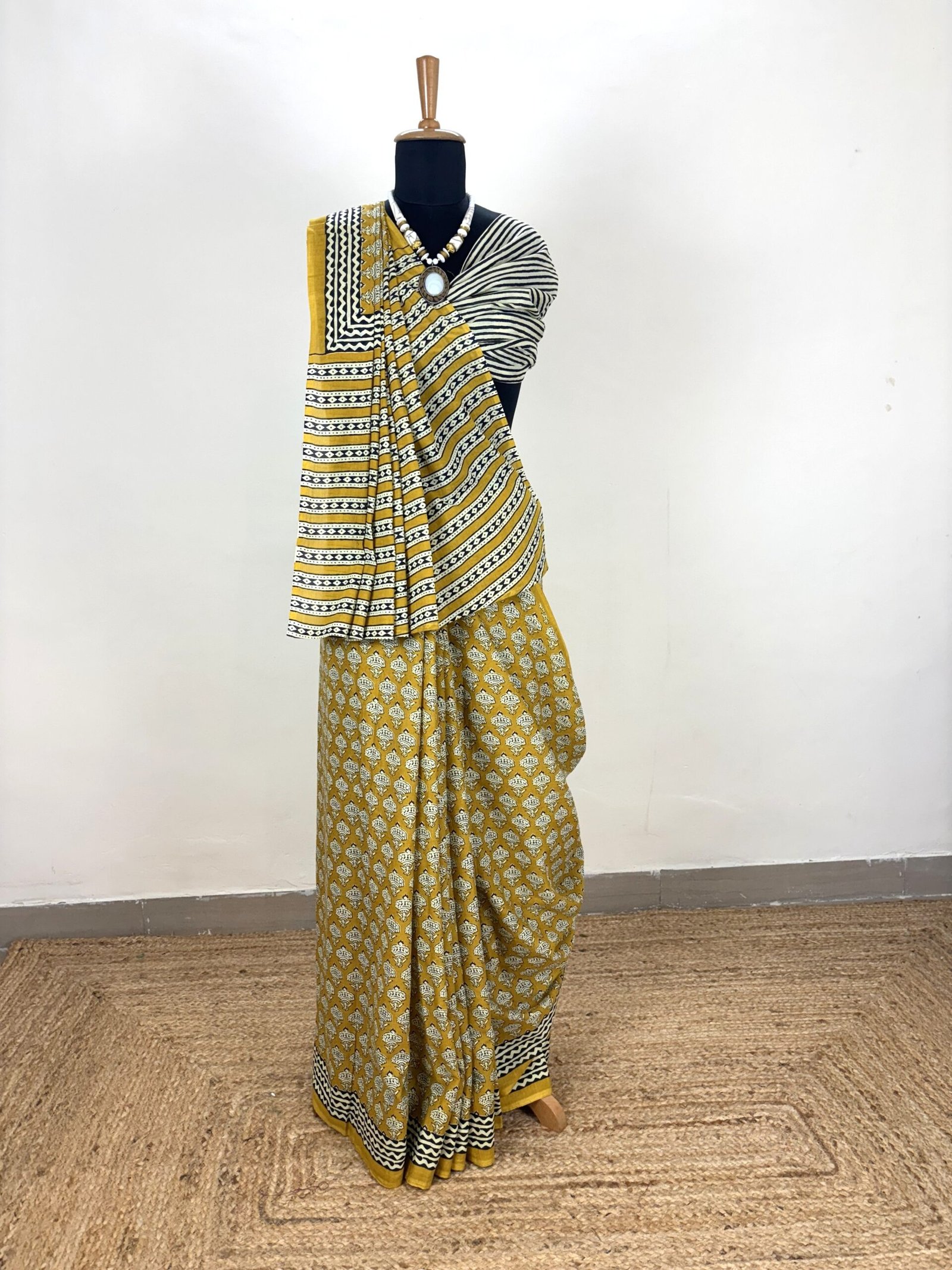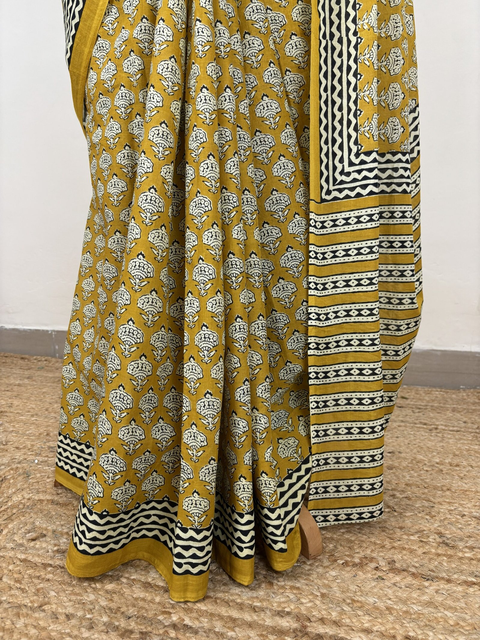 Crafted with timeless artistry, this mustard yellow cotton saree celebrates the elegance of traditional hand block printing. The saree features intricate floral motifs across the body, complemented by a contrasting striped pallu and border in black and white. Each pattern is meticulously hand-printed by skilled artisans, making every piece unique.