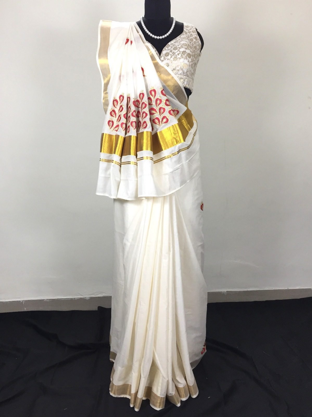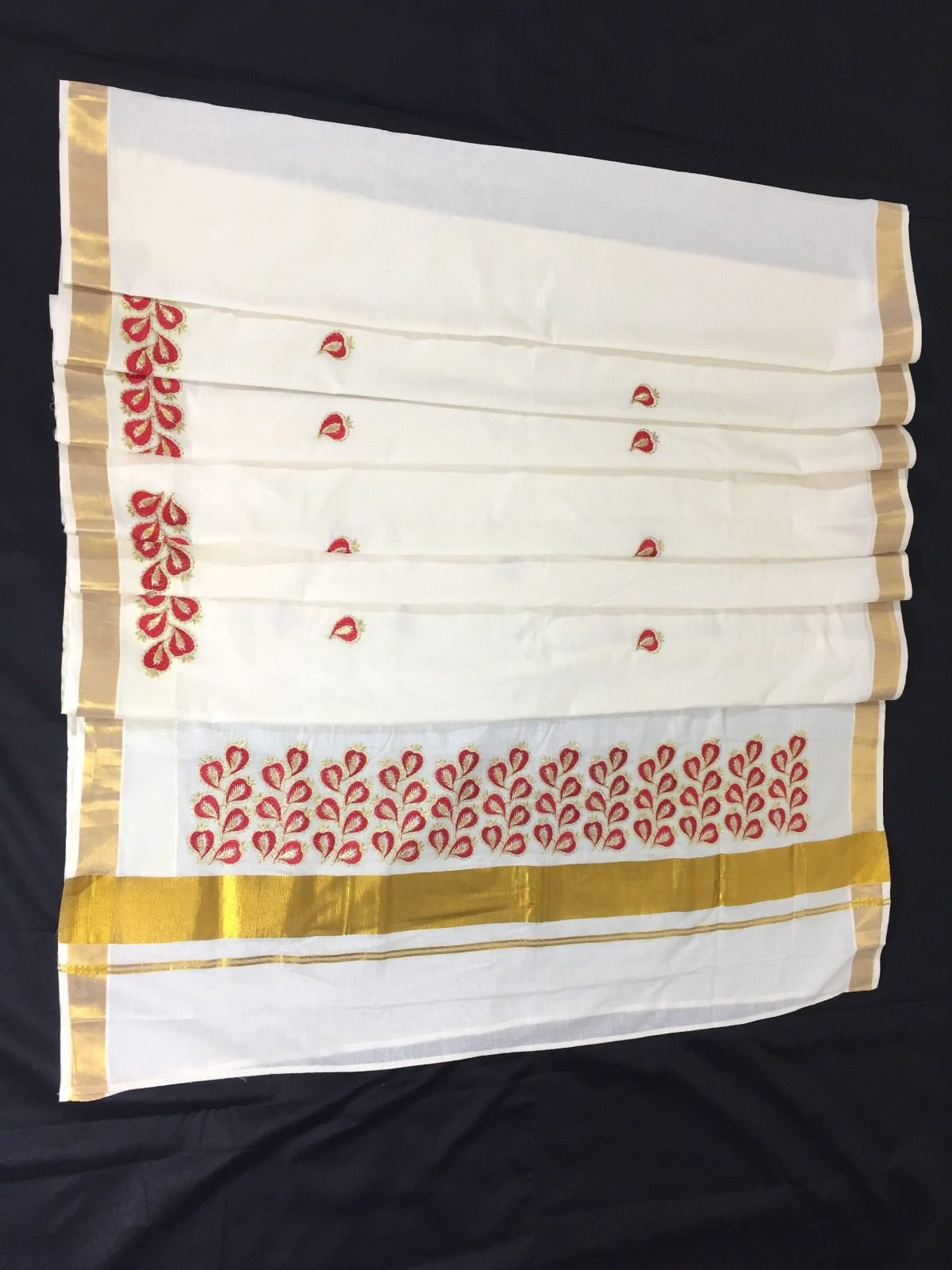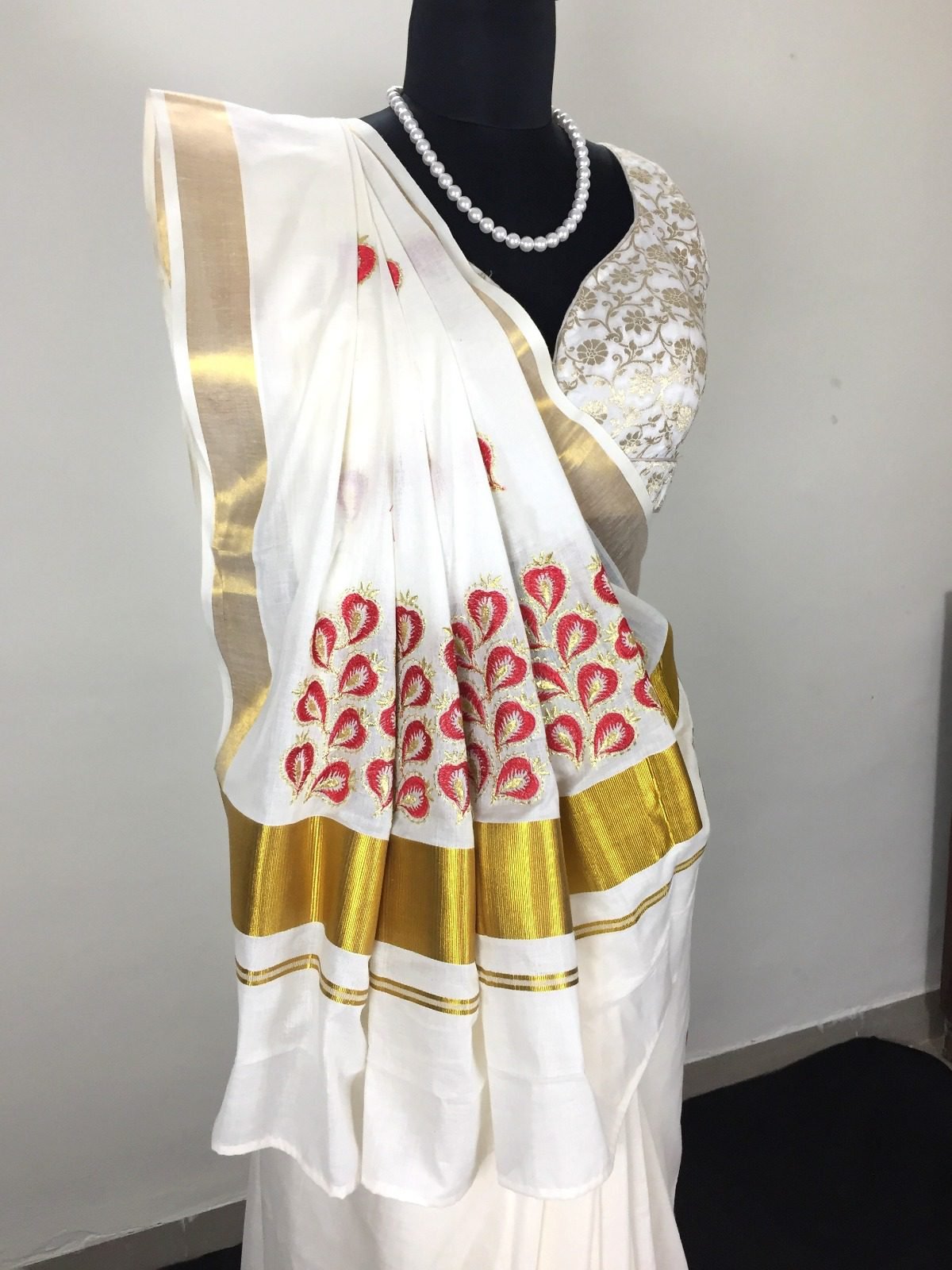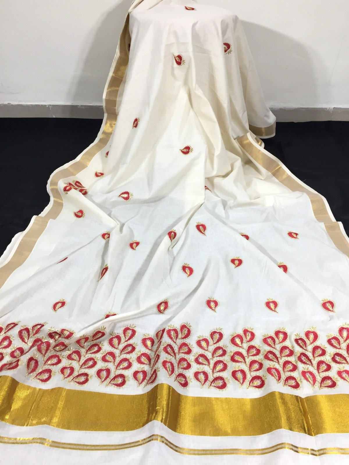 Price Inclusive of all TaxesIvory Kerala Handloom Cotton Festive Saree with Red & Gold Embroidery and Golden Kasavu Border