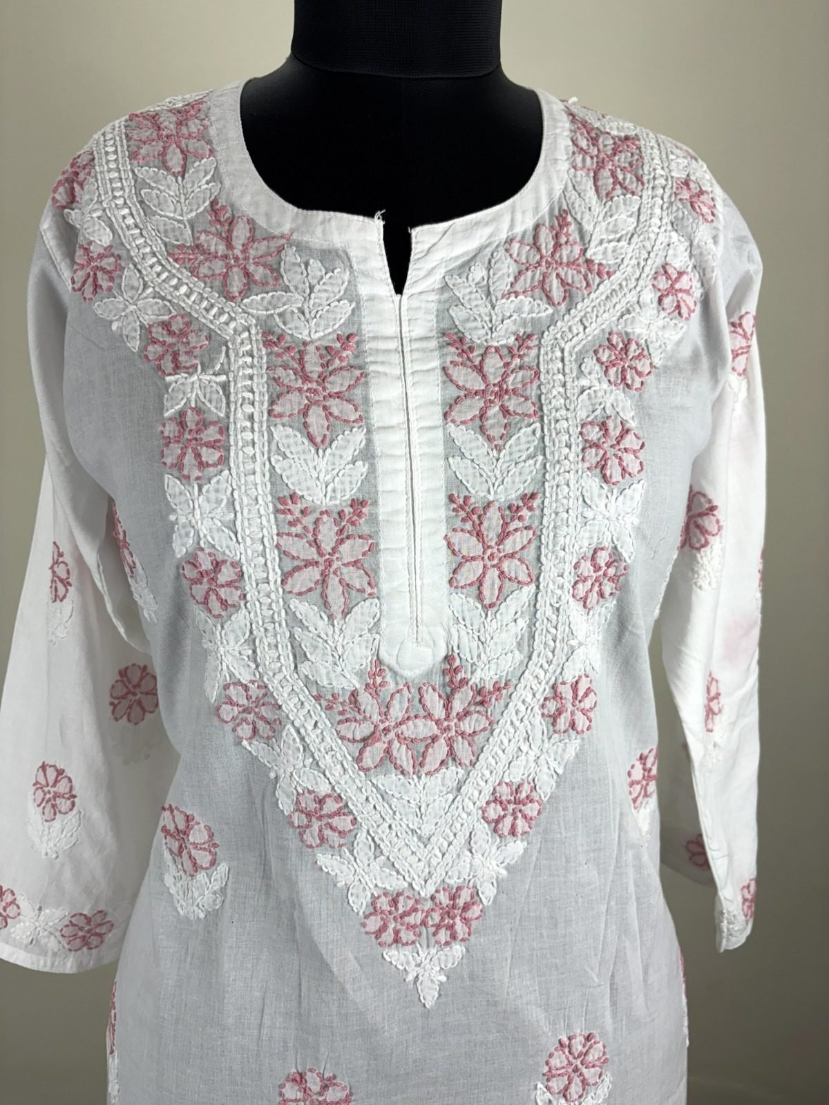 Cotton White Chikankari Kurta with Handmade Pink Embroidery