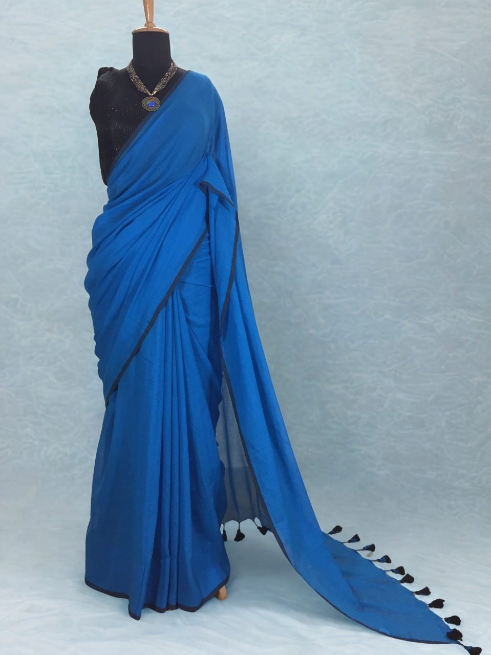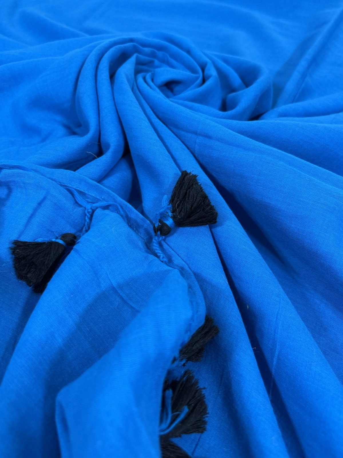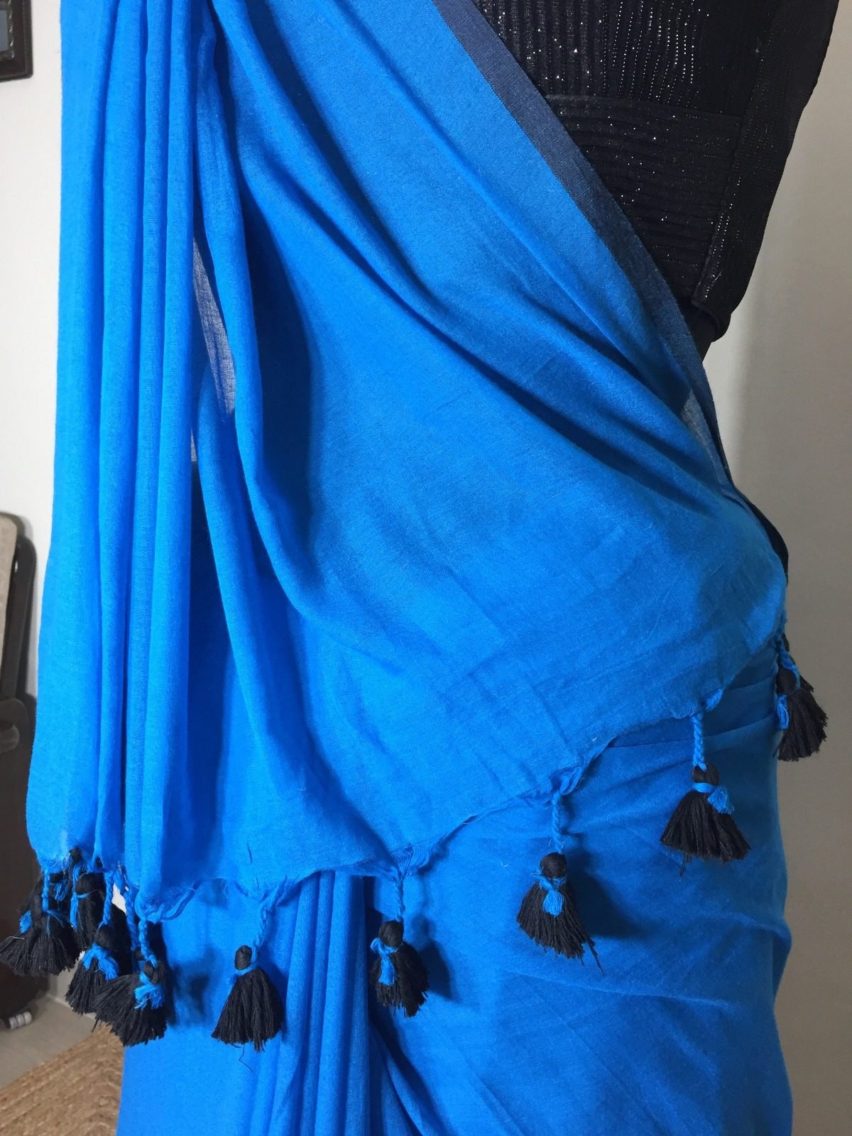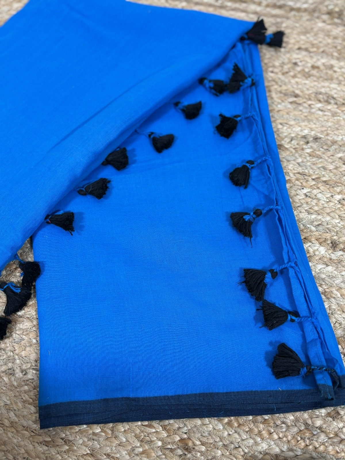A stunning blend of simplicity and sophistication, this Blue Mul Cotton Saree with Black Tassels is a timeless piece that exudes effortless elegance. Crafted from the softest mul cotton, it drapes beautifully, offering a feather-light feel and breathable comfort. The rich blue hue radiates calm and confidence, while the sleek black border and handmade tassels on the pallu add a striking contrast and artisanal charm. Perfect for those who appreciate minimal yet refined style.