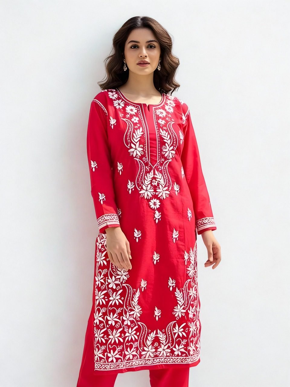 A striking blend of tradition and elegance, this Cotton Red Chikankari Kurta with White Handmade Embroidery is a timeless piece that celebrates the artistry of Lucknow’s renowned craftsmanship. Made from soft, breathable cotton, it ensures comfort while exuding vibrant sophistication. The kurta features intricate white hand-embroidered Chikankari motifs that beautifully contrast against the rich red base. Detailed floral and vine patterns adorn the neckline, sleeves, and hemline, creating a graceful and balanced design. The round neckline with a front slit adds a refined touch, making it perfect for festive occasions or elegant day wear.