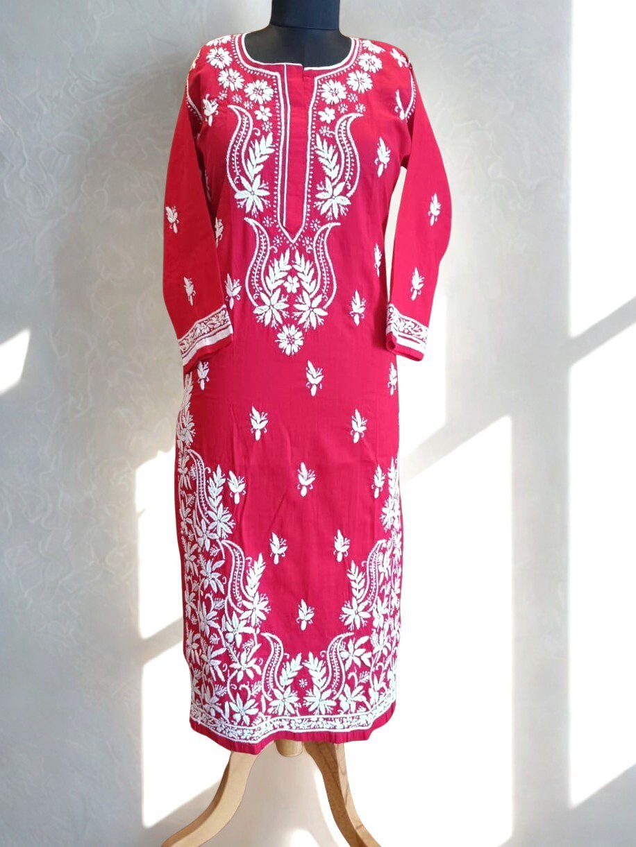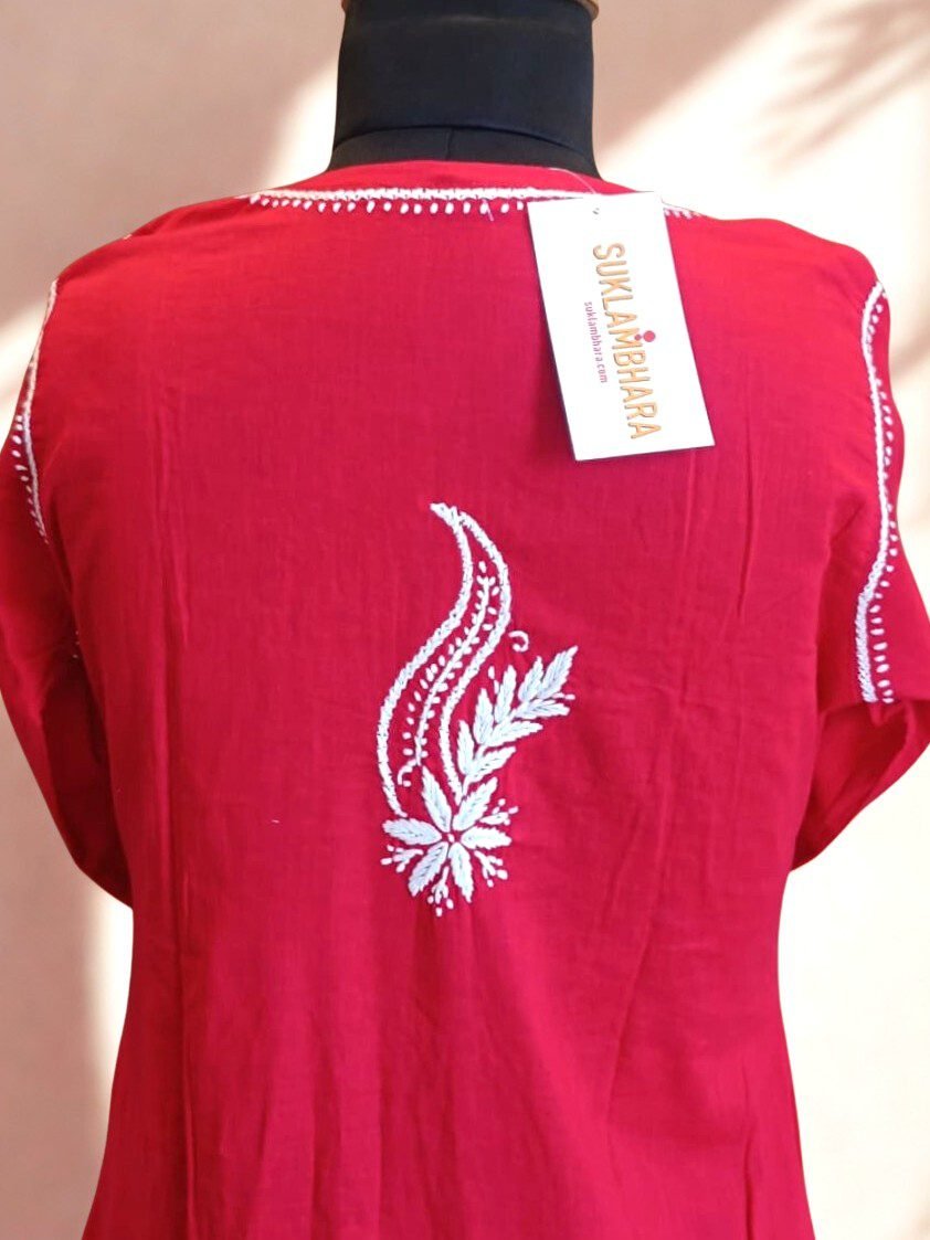 Cotton Red Chikankari Kurta with White Handmade Embroidery