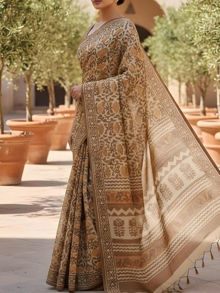 The saree features traditional Bagru floral motifs in deep brown and beige hues, meticulously hand-printed using natural dyes. The intricate border and pallu showcase geometric and floral patterns that add depth and character to the design. Lightweight and breathable, this saree embodies the charm of handcrafted artistry and sustainable fashion.