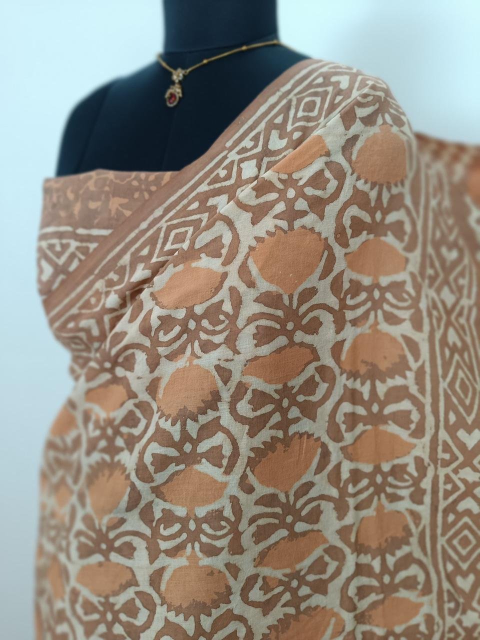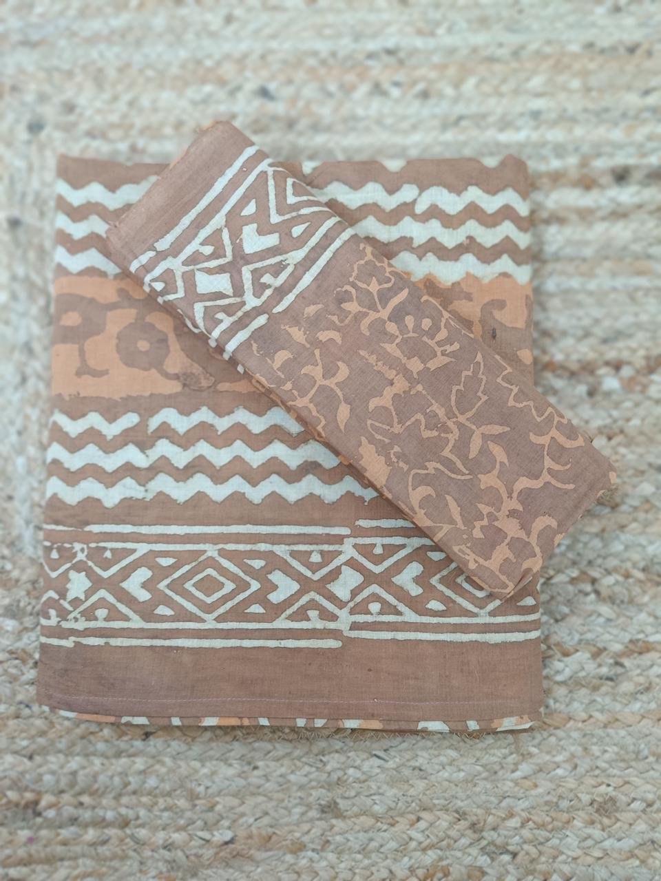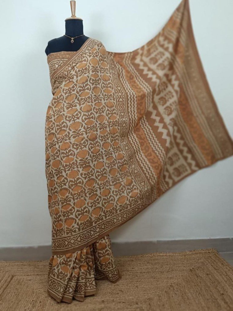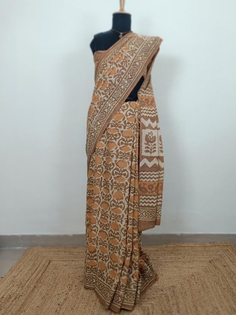 Price Inclusive of all TaxesBagru Handblock Print Soft Mul Cotton Rust Brown & Biege Saree